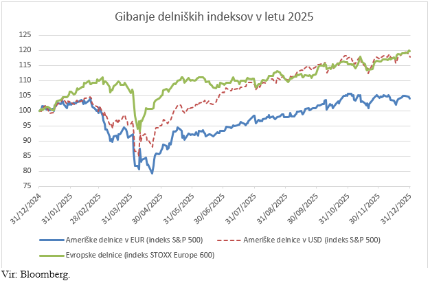 Leto 2025 so zaznamovali izrazita politična negotovost, uvedba visokih ameriških carin in nihanja v tehnološkem sektorju zaradi umetne inteligence (UI). Leto je bilo izjemno donosno za evropske in slovenske delnice, pri čemer so se prve podražile za +19,8 %, slednje pa za +58,0 %. Donosnost v ameriških dolarjih je bila tudi precejšnja za ameriške delnice (+17,9 %), vendar je zaradi krepitve evra skozi leto (+13,4 %) donosnost v evrih precej nižja, in sicer pri +3,9 %. Na ameriškem delniškem trgu sta bili najdonosnejši panogi komunikacijskih storitev (+17,8 %) in informacijske tehnologije (+9,4 %), najmanj donosni pa panogi potrošnih dobrin (-8,4 %) in nepremičnin (-9,0 %). Na evropskem delniškem trgu se je najbolj izkazal bančni sektor, ki se je podražil za +76,7 %, najmanj donosen pa je bil sektor medijev (-12,8 %). Kaj je gnalo ali zaviralo kapitalske trge v letu 2025 pa v nadaljevanju.